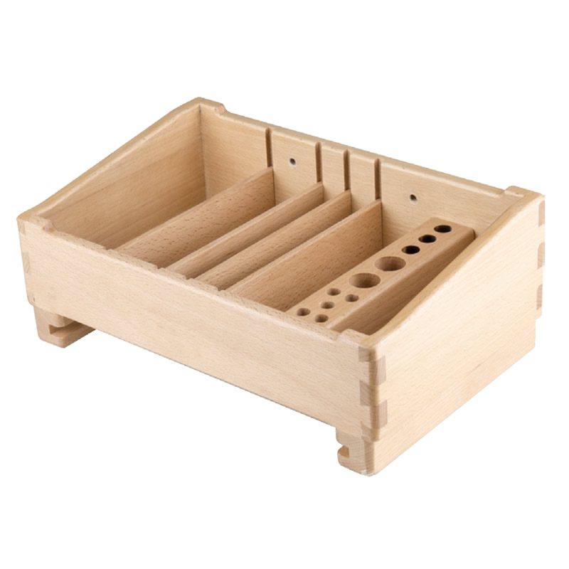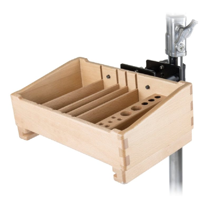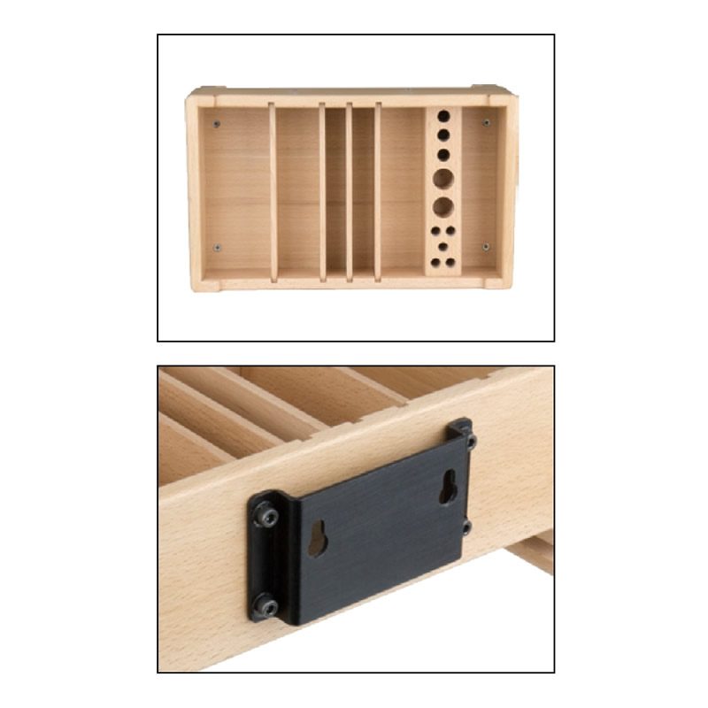 Camera assistant front box is designed to be attached onto tripods and holds items like markers, cleaning supplies, tools and a standard slate board. Kupo front box is made of high quality European beech comes with natural finish. Features four removable and interchangeable dividers to meet your particular needs. One pen holder fixed on the box included variously sized holes for your pens and cine tools. Slots on the underside of the front box hold standard sized slates board.