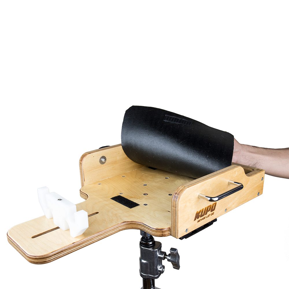 Made of european beech, the Kupo camera cradle allows you to convert your stand or tripod into a camera docking cradle during set lighting, talent blocking, and rehearsals. It features a 3/8”-16 underneath the cradle that can mount with tripod directly. Alternately, the cradle can be mounted on the light stand with the ball head adapter (KS-097lb included) which is 16mm inside and 28mm outside in diameter. The removable white nylon rod holder is mounted for rod size measured 15mm or 19mm in diameter. Mounting slots under the cradle are equipped makes it a snap to additional accessories with u-shaped sliding plate (check tethermate accessories page). The velcro strap through U handle helps fasten objects on the cradle securely.