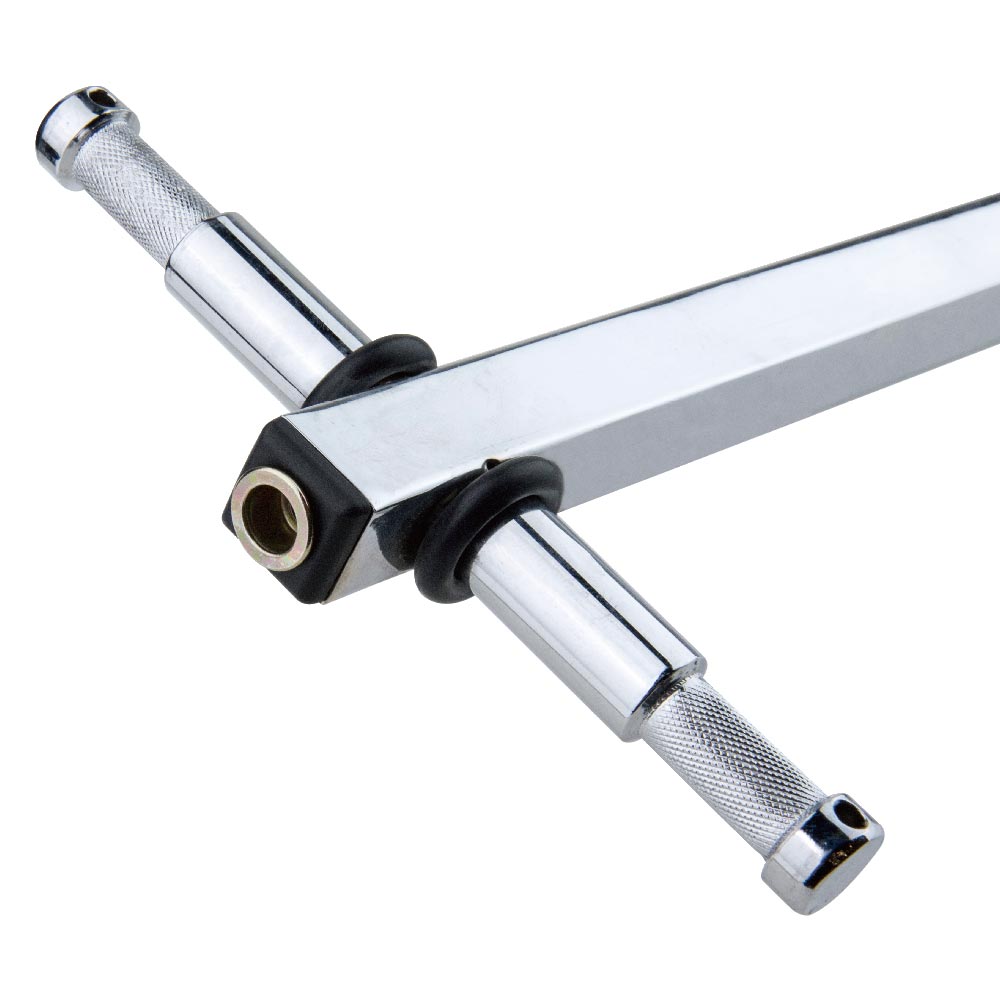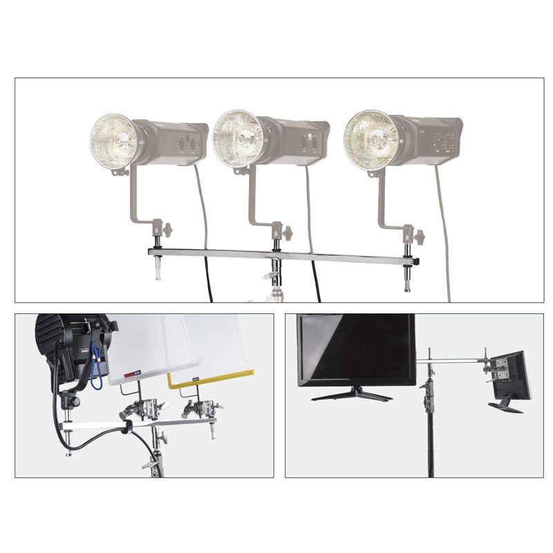 The handy adapter allows you to mount multiple light fixtures or accessories onto a single light stand. Features five baby studs with embossed necks welded onto sturdy steel measured 20mm(H)X20mm(W)X800mm(L) and offset for mounting five lights. It can be mounted on the stand top of a baby stud (16mm) or fit into a junior receiver (28mm) Additional 5/16″-18 threaded nub on the side of bar to hold the knob when using on a junior stand.