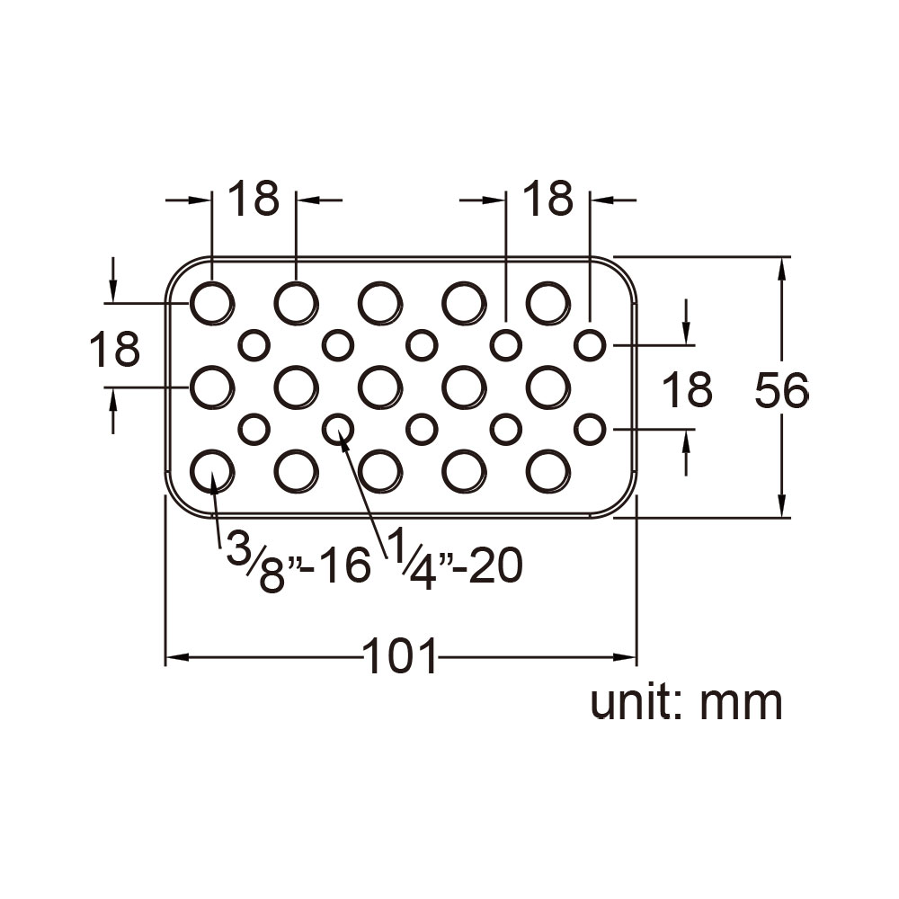 A precision machined multiple threaded aluminum plate with 3/8”-16 x 15pcs and 1/4”-20 x 10pcs holes. Itʼs good for mounting monitor and video transmitter within the same plate while working with an articulated arm or a universal light stud. L:3.97″(100mm) w:2.2″(56mm) t: 0.236ʼʼ(6mm)