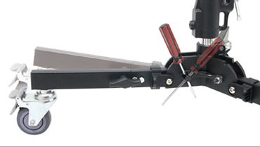 The Kupo 340 Roller Base Stand with wheels is specifically designed for lighting fixtures that need to be placed in low positions. Features a quick-release locking system equipped on each leg for folding and unfolding the stand within seconds. It also comes with a universal stand top that allows it to fit into any fixture. Comes with a junior pin or baby receiver. Meanwhile, your own rolling stand is available by simply adding a century stand column into the junior receiver (28mm socket). One leg is supplied with a leveling device for adjusting the stand on uneven ground. One extendable leg (additional 12cm / 4.7″) is designed for allowing an increase to the loading capability while connecting a boom arm.