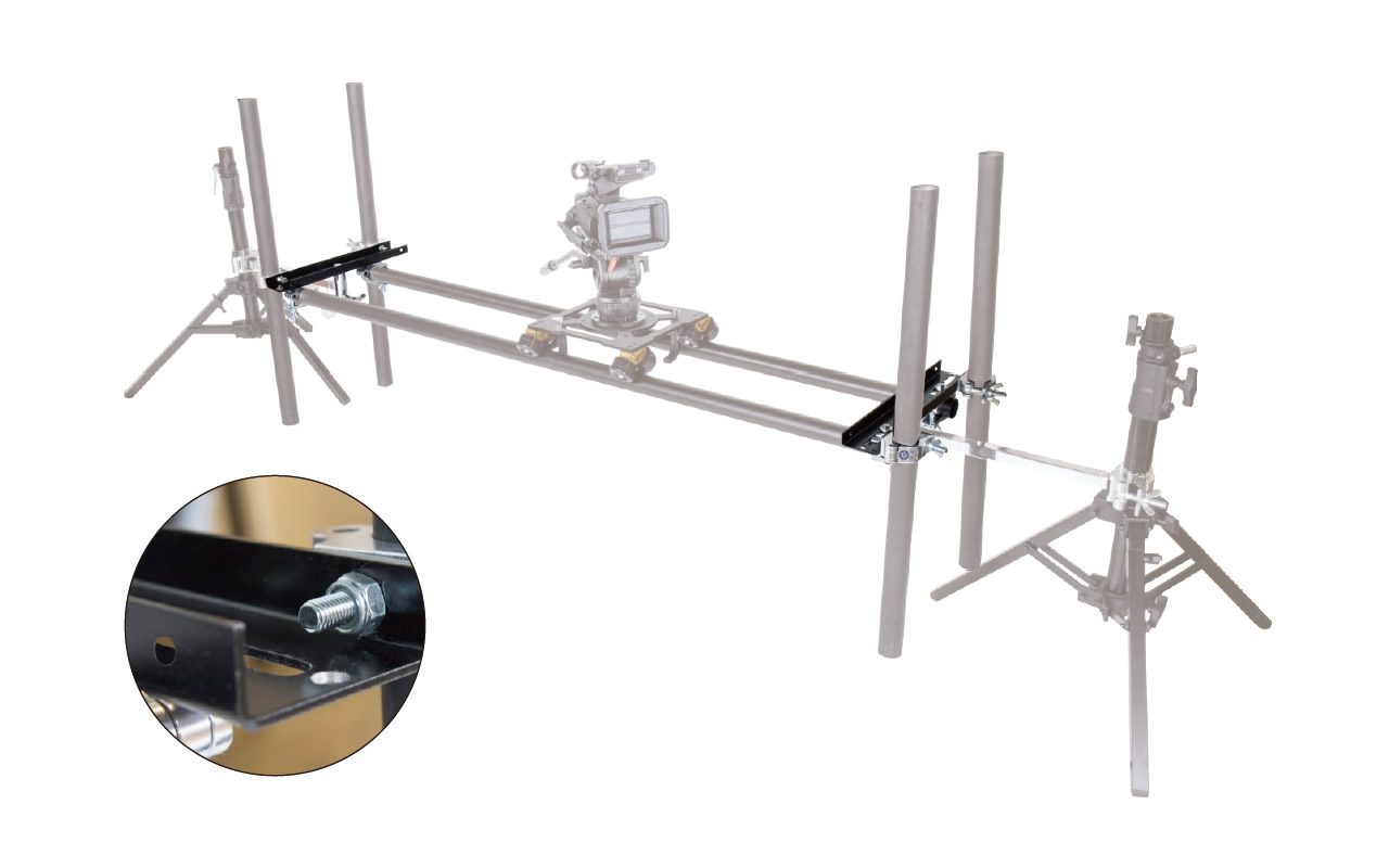 The Universal Track End is specially designed for slider/dolly with 2” (48~50mm) rail in diameter. The TVMP adapters terminated at the center of the bracket allow to mount on any lighting stands come with a baby stud or junior receiver. The U-shaped structure also makes the brackets a great free-standing on the floor while the low-angle shot is needed.